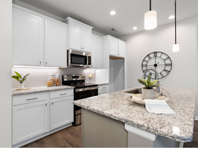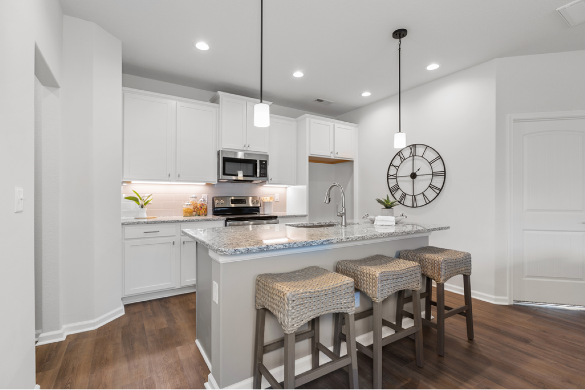 - Beautiful Kitchen with white shaker cabinets, accented island, granite counters, tile backsplash and under cabinet lights.